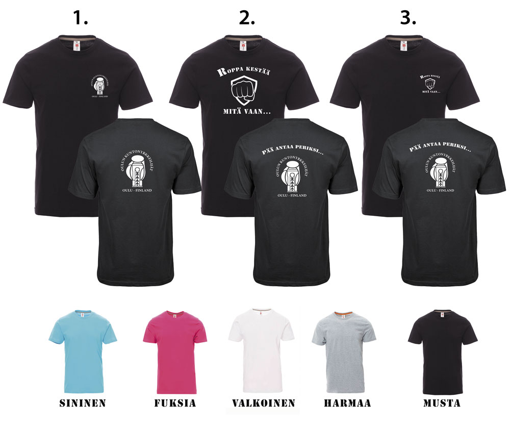 Mallit nähtävissä salilla ennen ja jälkeen treenin. Värejä on viisi erilaista ja painatusmalleja kolme. Paitojen koot XS-5XL musta ja valkoinen, koot XS-3XL sininen, fuksia ja harmaa.